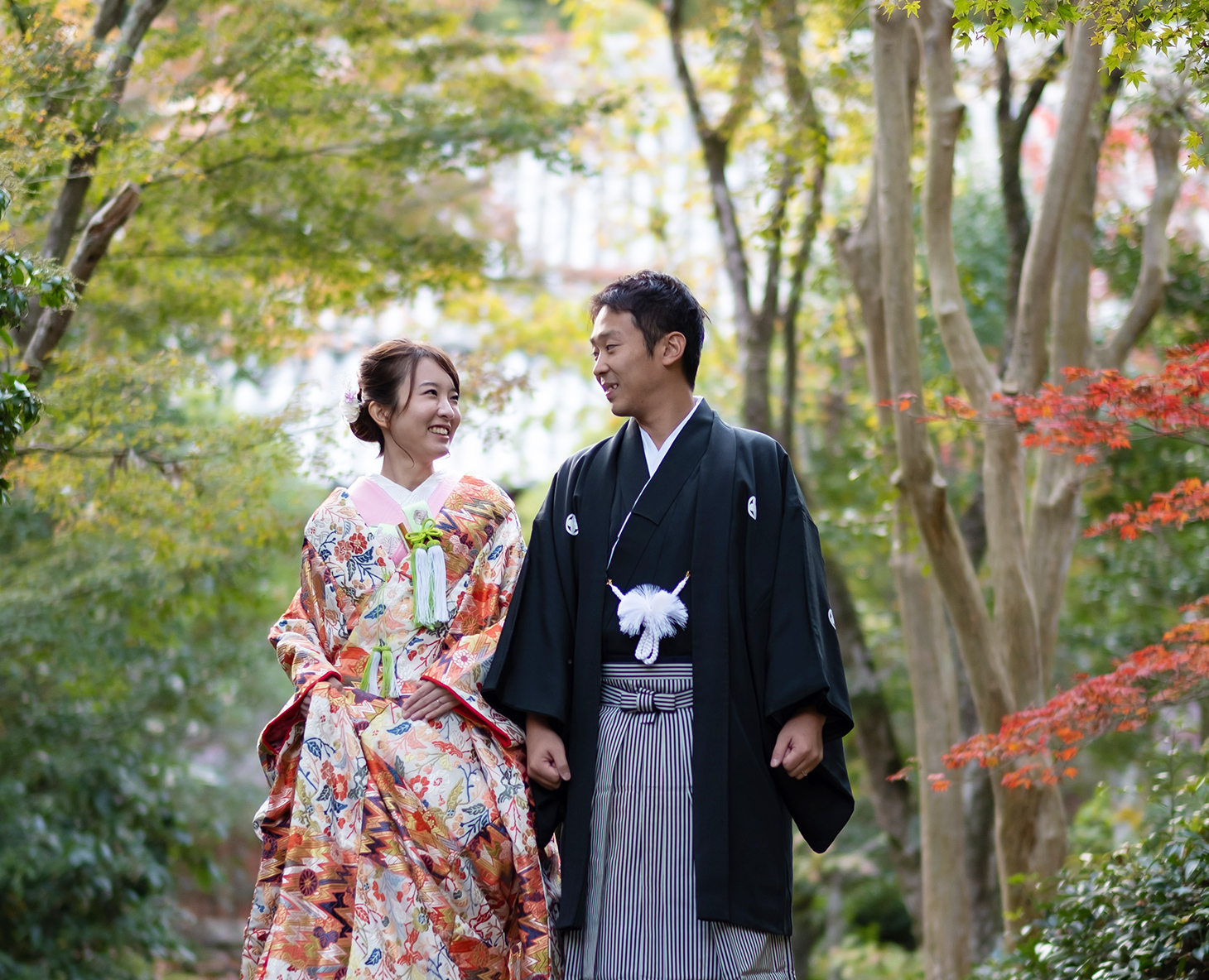 結婚式の前撮りや当日の出張撮影などを行います。前撮りには和装の豪華衣装のご用意もできます。